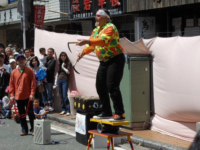 体重120kgオーバーのブッチリードさん、巧みな話術と素晴らしいバランス感覚でジャグリングを見せてくれました