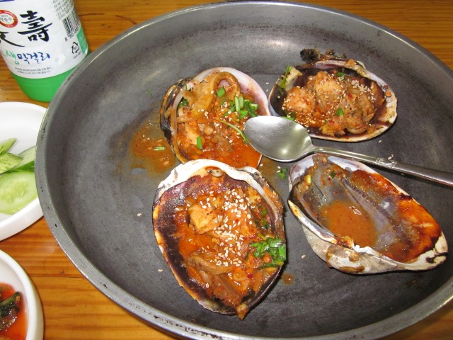 次に注文したのが、このバカでかいハマグリを焼いたやつです。 香ばしくてマッコリを2本飲んじゃいました。